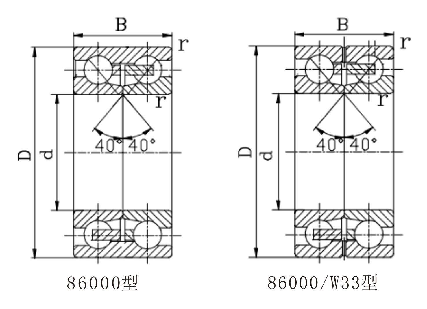 雙列角接觸球軸承與四點角接觸球軸承的結構相似同樣有雙半內圈整體外圈及雙半外圈整體內圈的結構,但不可分離。能承受較大的徑向負荷為主的徑向和軸向聯合負荷和力矩負荷,限制軸的兩方面的軸向位移。主要用于限制軸和外殼雙向軸向位移,雖然軸承可承受雙向軸向載荷,但若一側有裝球缺口時,則應注意不要讓主要軸向載荷通過有缺口的一側溝邊。在軸承使用時應注意使不帶裝球缺口的一側滾道承受主要載荷。